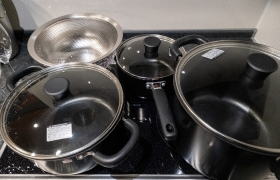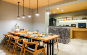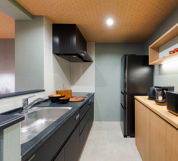 IHシステムキッチンで、快適に料理を楽しめます。冷蔵庫、ケトル、電子レンジ、コーヒーマシーン、炊飯器、トースターなど、調理に調理に役立つ設備も充実しています。