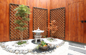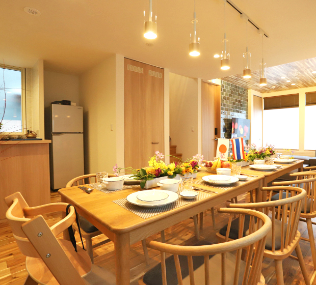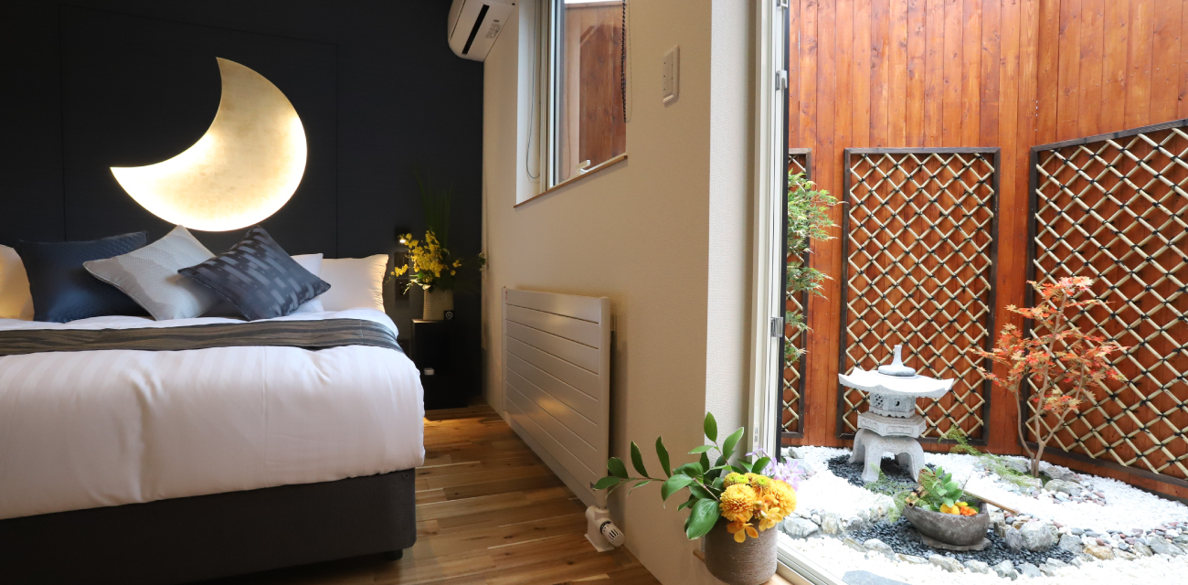 リビングダイニングルームには、ゆったり座れるソファベットと8人まで座れる大きなダイニングテーブルがあります。寝室や浴室の窓から見える日本庭園のような中庭が特長です。