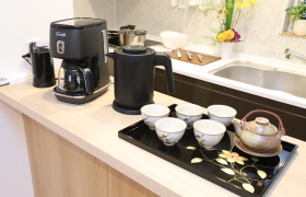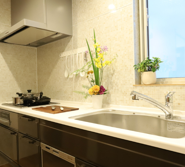 広々としたIHシステムキッチンで、安心して料理を楽しむことができます。ビルトイン型の食器洗浄機も設置、片付けも楽々です。各種調理家電、食器類、調理器具も充実しています。