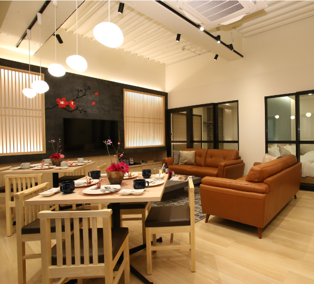 リビングルームにはダイニングテーブルを2つ配置、8人まで座れます。大型のテレビが特徴のリビングでは、映画などの娯楽も楽しむことができます。