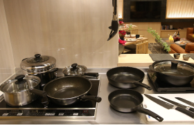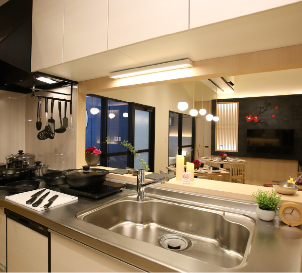 広々としたIHシステムキッチンで、安心して料理を楽しむことができます。ビルトイン型の食器洗浄機も設置、片付けも楽々です。各種調理家電、食器類、調理器具も充実しています。