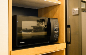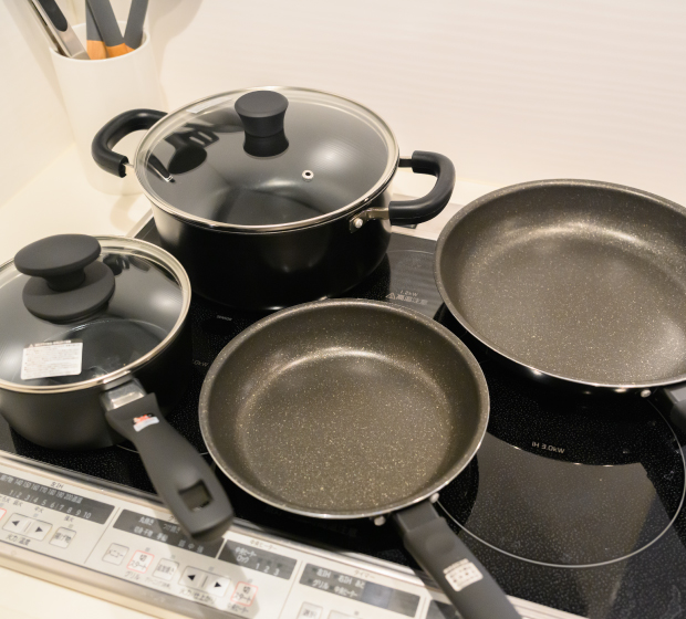 IHシステムキッチンで、快適に料理を楽しめます。冷蔵庫、ケトル、電子レンジ、コーヒーマシーン、炊飯器、トースター、コーヒーミルなど、調理に調理に役立つ設備も充実しています。