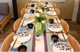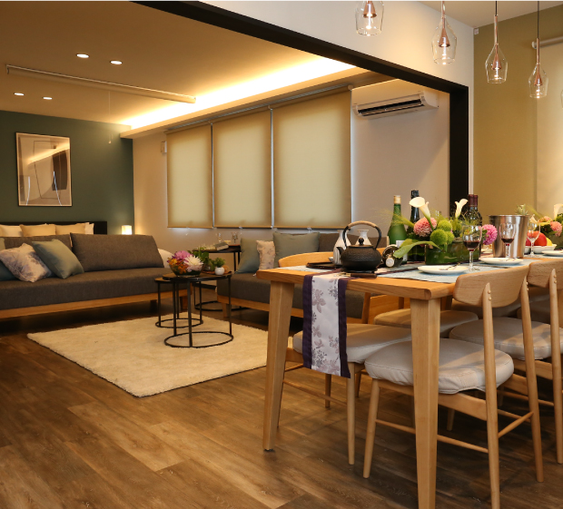 リビングルームには8人まで座れる大きなダイニングテーブルを配置。大きな窓から北海道大学のポプラ並木が見えるので、室内にいながら自然を感じられます。マッサージチェアも完備。