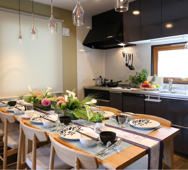 広々としたIHシステムキッチンで、安心して料理を楽しむことができます。ビルトイン型の食器洗浄機も設置、片付けも楽々です。各種調理家電、食器類、調理器具も充実しています。