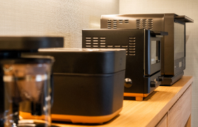 IHシステムキッチンで、快適に料理を楽しめます。冷蔵庫、ケトル、電子レンジ、コーヒーマシーン、炊飯器、トースターなど、調理に調理に役立つ設備も充実しています。