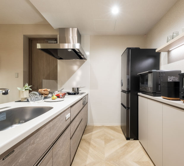 IHシステムキッチンで、快適に料理を楽しめます。冷蔵庫、ケトル、電子レンジ、コーヒーマシーン、炊飯器、トースター、コーヒーミルなど、調理に調理に役立つ設備も充実しています。